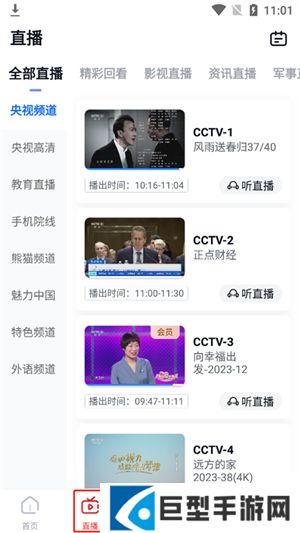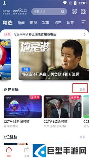 3、当然,用户也可以返回首页,点击直播栏目,它为用户提供了详细的直播分类,如影视、资讯、军事、体育、纪实等等直播类型;