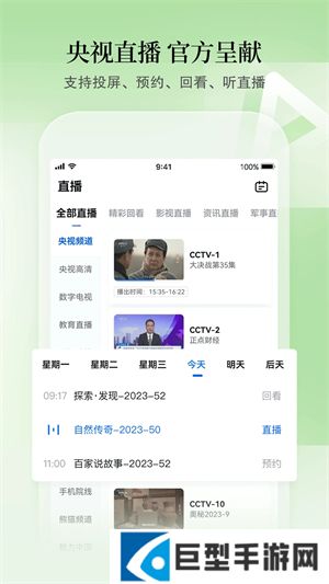 CCTV手机电视app是央视旗下公司推出的一款手机电视软件,拥有CCTV-1到CCTV-17、央视频道、体育频道、电影频道、财经频道、儿童频道、军事频道、纪录片等上百个电视频道,满足用户不同的观看需求,让您随时随地畅享电视节目。除了电视节目外,CCTV手机电视app还提供了综艺、熊猫tv、电视剧等多种资源,让用户可以尽情享受各种精彩内容。观看过程中,用户可以记录观看进度,方便下次继续观看。如果您想要随时随地观看精彩电视节目,那么CCTV手机电视app绝对是您的必备软件。