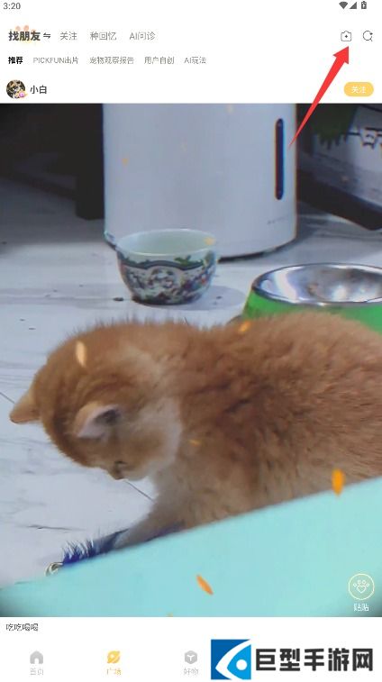3、进入广场界面可浏览其他用户发布的宠物动态,点击右上角相机图标开始创作。