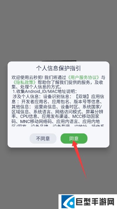 云秒剪免费软件怎么去水印1、首次使用需阅读用户服务协议与隐私政策内容,确认后点击同意按钮进入应用。