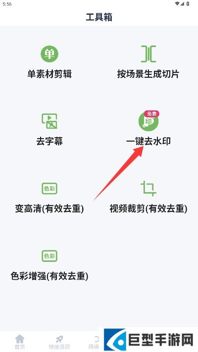 3、进入主功能界面后选择工具箱栏目,点击一键去水印功能进入操作页面。