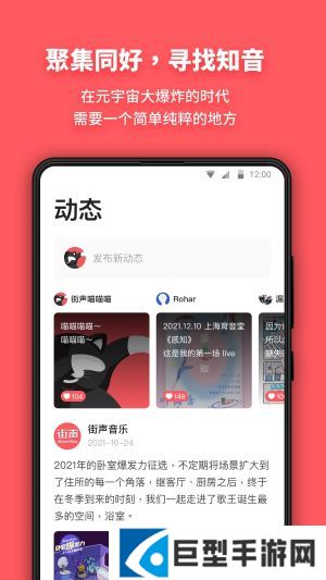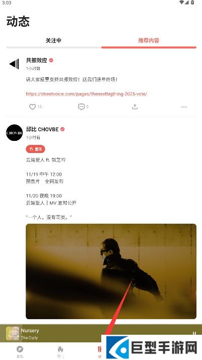 4、切换至动态频道可查看平台用户发布的最新动态内容,了解音乐圈实时资讯。