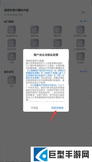 cc直播下载手机版使用教程1、首次启动应用时,系统会显示用户协议和隐私政策,阅读后点击同意按钮进入主界面。