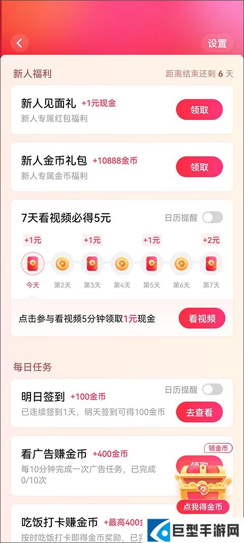 2、作为新人是最容易赚钱的,不仅提供了新人福利奖励,并且只需要看视频签到7天就能够立刻获得现金奖励,除此之外,还可以做每日任务来增加金额。