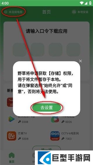 打开野草助手手机版后,点击左上角的“未连接电视”,会有如图的弹窗提示,点击“去设置”;
