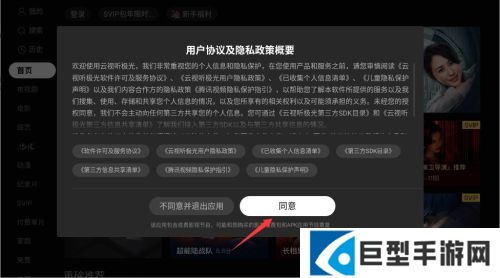 腾讯极光tv最新版(云视听极光)使用教程1、首次启动应用时,系统会显示用户协议和隐私政策,阅读后点击同意按钮进入主界面。