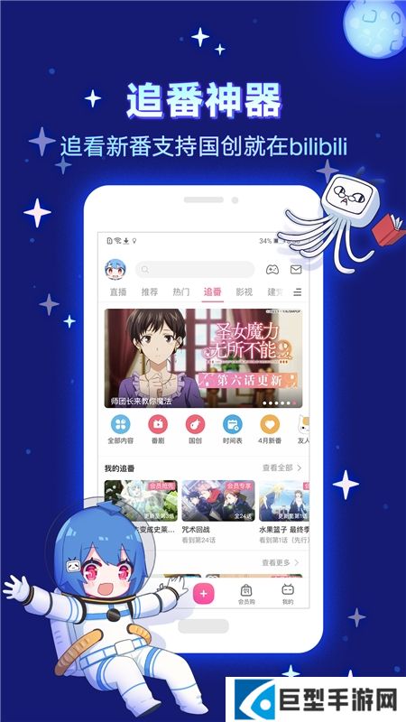 2.哔哩哔哩动画App所包含的资源是非常丰富的,在其主界面上,可看到个人中心、分区导航、新番专题和放送时间表。所以,用户通过这些模块,可以快速的找到动漫的合集、相关的娱乐信息、音乐以及相关的游戏等,其内容十分的广泛。每当有新动漫更新时,相应的中文视频也会被快速的做出来并且退出来。