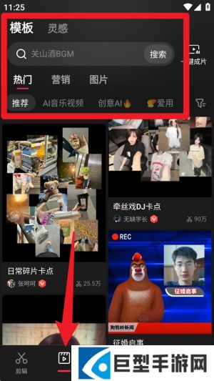 2. 切换至“剪同款”页面,选择上方“模板”栏目,可搜索热门BGM并套用视频模板制作。