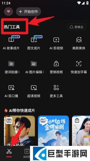 剪映专业版使用教程1. 进入首页点击下方“剪辑”图标,即可浏览热门工具区,包含剪视频、美颜、字幕等功能。