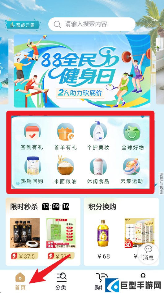 5、进入商城页面后,可在顶部分类区选择签到有礼、首单有礼、个护美妆、全球好物等板块,点击对应图标即可进入相关商品专区进行选购。