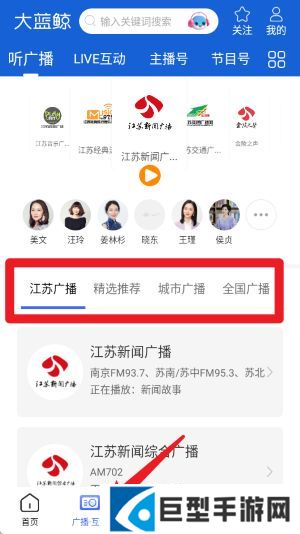 2、进入“广播·互动”栏目,可选择江苏广播、城市广播及全国广播等频道进行收听与互动。