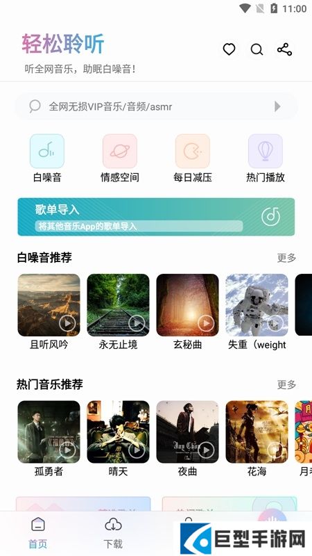 聆听音乐是一款小巧简洁的音乐软件,轻松搜索全网无损音质音源,可将其他音乐APP歌单导入,更有助眠白噪音,两种相结合,可以满足失眠的朋友。