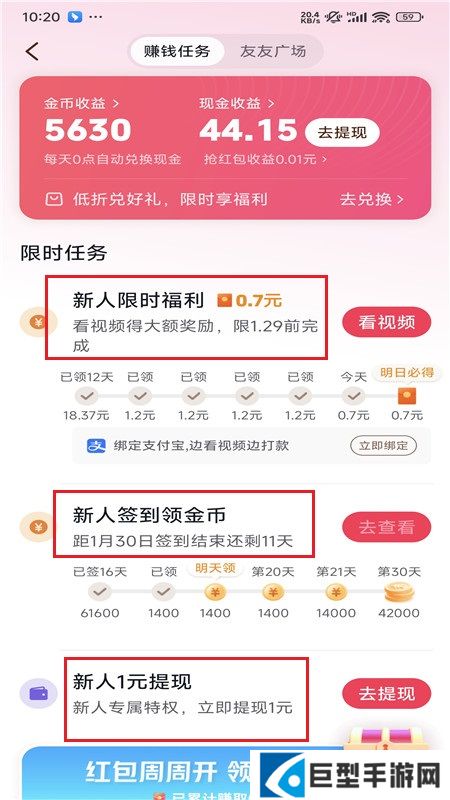 3、进入到赚钱任务页面后,这里有限时任务、新人限时福利、新人签到领金币、下载APP任务、看广告赚金币、预约一键领金币、逛街赚钱、邀请好友赚钱等多种形式的任务;