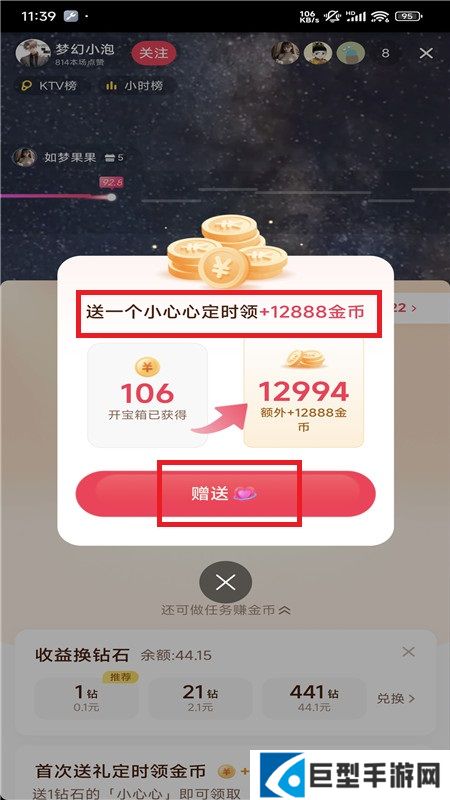 3、宝箱开启后,会弹出送一个小心心定时领多少金币的页面,可以点击下面的赠送,送主播一个小礼物即可获取大量金币;