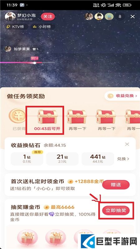 4、你还可以在直播间做任务领奖励,观看直播到一定的时间即可开启对应的宝箱,宝箱里面的金币统统免费领取,也可以点击抽奖赚金币抽取大量金币!
