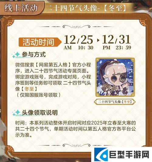 游戏账号总对局≥1000场且30天内有登录记录的访客,可在12月14日10:30-12月15日23:59期间微信搜索【第五人格官方小程序】,进入【庄园二十四节气演绎录活动-冬至徽章线下活动资格抽选】专属页面,获得参与资格的访客在线下活动期间完成全部互动活动后,出示小程序抽选界面(截图无效)完成打卡,领取【冬至】线下限定金属微章。