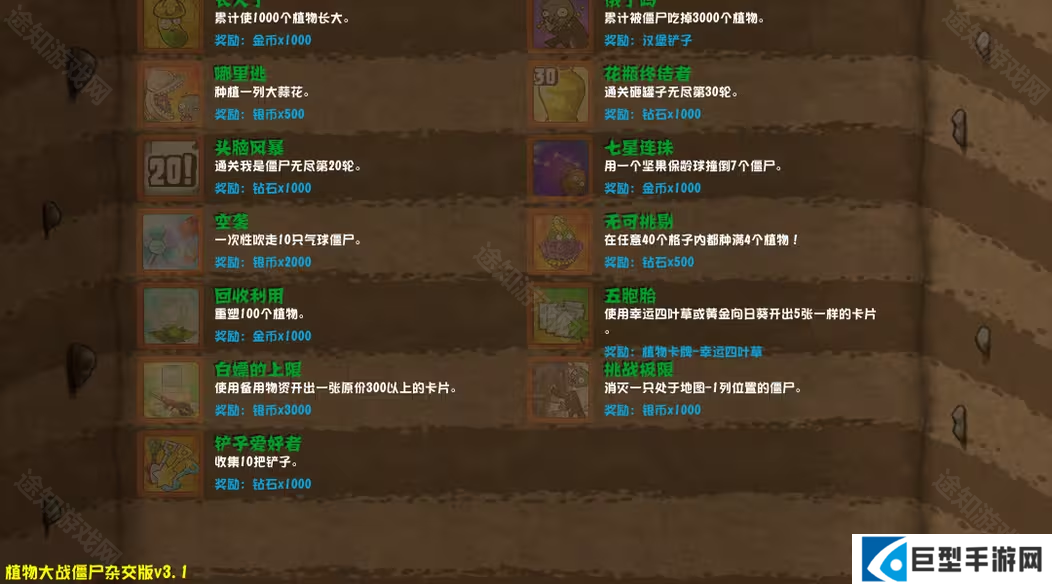 全新的成就系统,达成成就后可以获得银币、钻石和植物卡牌等奖励。