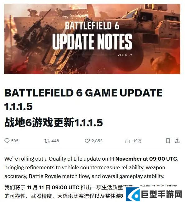 《战地6》目前已经在 PlayStation 5、Xbox Series X|S 和 PC 平台正式发售。1.1.1.5版本更新将于北京时间11月11日17:00面向全球玩家推送。