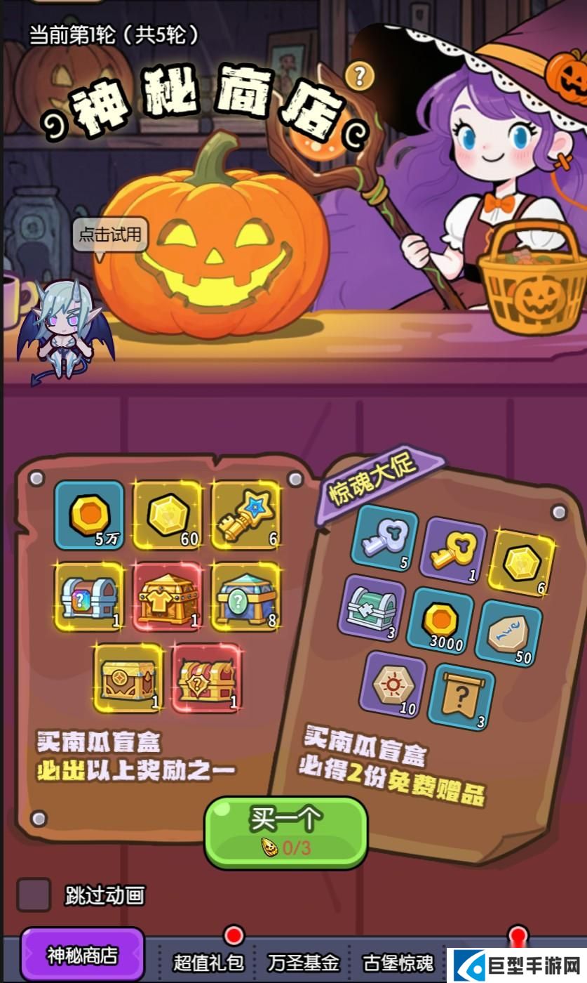 ②神秘商店正在进行限时大促销:每个南瓜盲盒都有一份不重复的惊喜大奖;买南瓜盲盒还会随机获赠2份赠品;