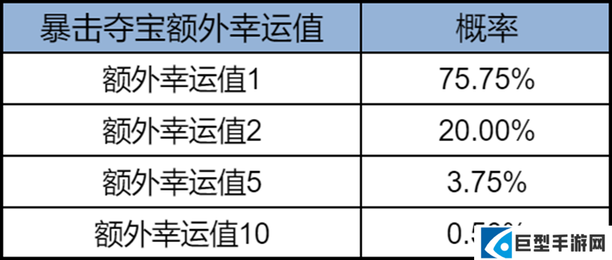 暴击夺宝有40%的概率额外获得幸运值,在触发暴击的情况下,获取额外幸运值的概率如下: