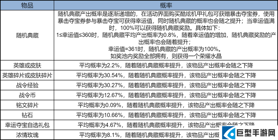 4、暴击夺宝奖励:每次暴击夺宝,有机会获得: 随机典藏奖励(具体物品详见下方随机典藏奖励说明)、皮肤、皮肤碎片、英雄碎片等奖励。