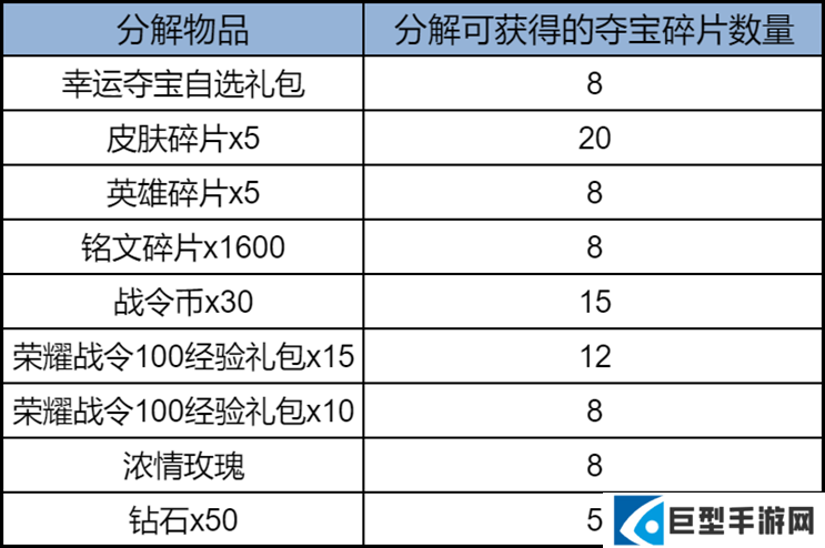 7、分解规则:在夺宝盒中,选中要分解的奖励,点击分解即可把对应奖励分解成夺宝碎片。分解规则如下: