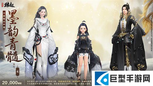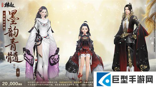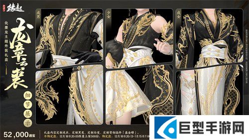 琼霰漫天舞,临妆映镜光。岁末将至,精彩不断,12月18日全新外观即将上架商城,为寒冬增添一份靓色!全新化墨龙主题外观礼盒「龙章云裘」以玄、素、灿金三色,绘新岁之象;外装礼盒「吉祥颂」以民族风搭配为侠士增添暖意;月度限定外观「墨韵青髓」2款全新偏色携6款经典偏色描绘丹青画魂;更有精美头饰及眼饰为侠士的搭配添彩。月度充消同步更新,三倍积分活动惊喜不断!