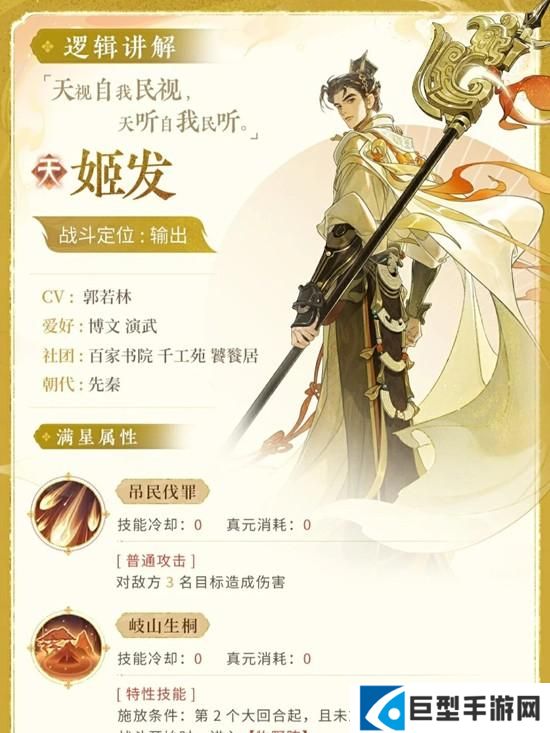 忘川风华录新名士姬发怎么样?姬发建立周朝的过程蕴含丰富战斗元素,为技能设计灵感源泉。“维师尚父,时维鹰扬。凉彼武王,肆伐大商,会朝清明。”在忘川中,姬发将作为输出名士登场,使君大人可点击下图,领略姬发牧野鹰扬、分封天下的君王气度!小编抱来了姬发简版技能,使君大人快来看看吧!