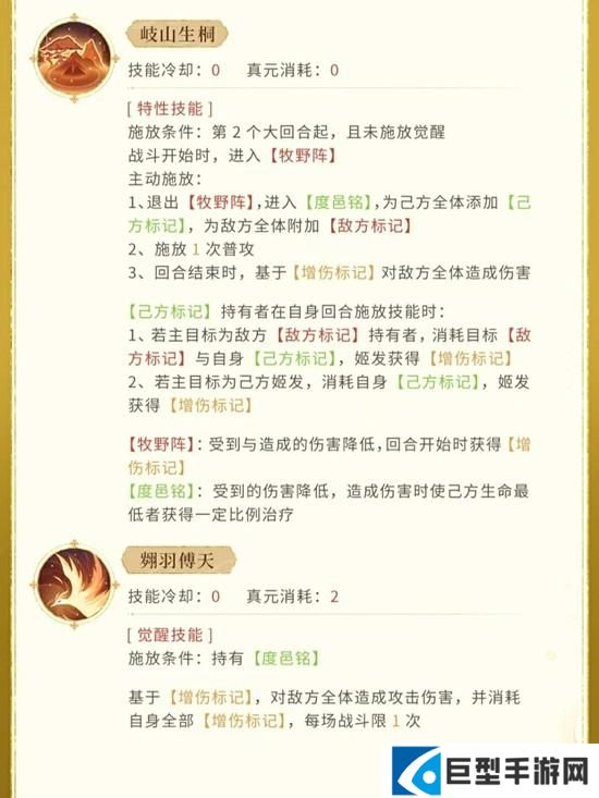 【己方标记】持有者在自身回合施放技能时:1、若主目标为敌方【敌方标记】持有者,消耗目标【敌方标记】与自身【已方标记】,姬发获得【增伤标记】2、若主目标为己方姬发,消耗自身【已方标记】,姬发获得【增伤标记】