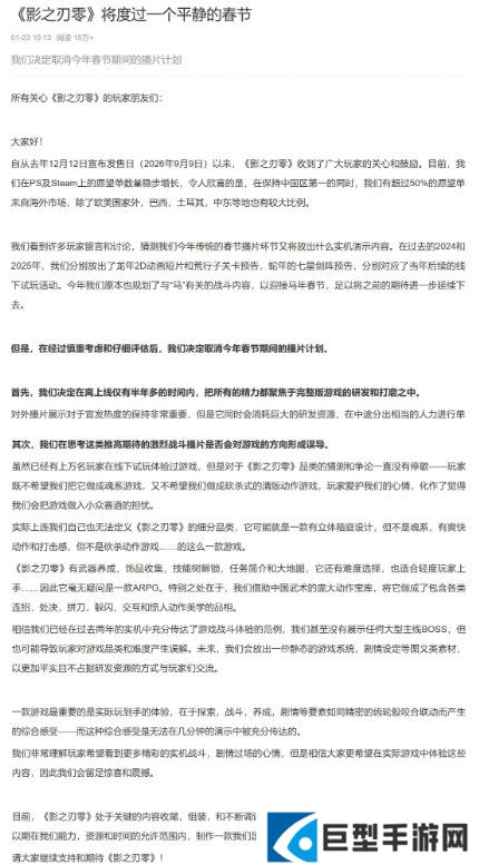 《影之刃零》制作人Soulframe在微博博客“《影之刃零》将度过一个平静的春节”中透露,“自从去年12月12日宣布发售日(2026年9月9日)以来,《影之刃零》收到了广大玩家的关心和鼓励。目前,我们在PS及Steam上的愿望单数量稳步增长,令人欣喜的是,在保持中国区第一的同时,我们有超过50%的愿望单来自海外市场,除了欧美国家外,巴西,土耳其,中东等地也有较**例。”