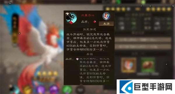 战斗开始时,锁定我军攻击最高、精神最高的2名武将:造成伤害后,恢复另一方此次伤害20%的生命值,最高50%;受到伤害时,伤害会转移50%给另一方。