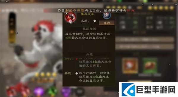战斗开始时,对全体敌军造成4%最大生命值的真实伤害。最大10%。