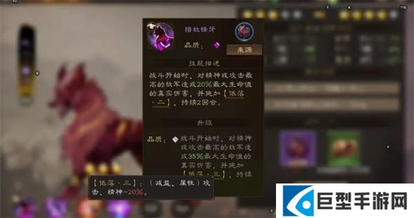 战斗开始时,对精神或攻击最高的敌军造成15%(最高35%)最大生命值的真实伤害,并施加低落持续2回合。低落:攻击精神-15%,最高20%。