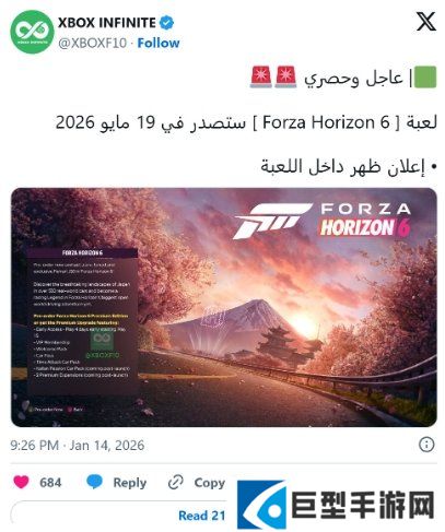 沙特阿拉伯Xbox新闻网站Xbox Infinite发布了一张他们声称出现在“游戏内”的公告图片。公告称游戏的高级版将让玩家提前体验游戏,允许玩家“从 5月15日开始提前4天游玩”,这意味着《极限竞速:地平线6》的正式发售日期为5月19日。