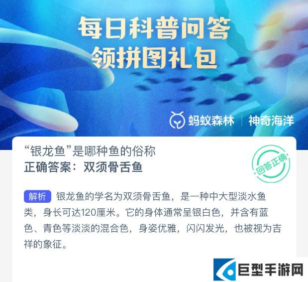“银龙鱼”是哪种鱼的俗称?【神奇海洋】10月24日新题目已开答!正确答案现已公布,点击领取拼图,一起为修复海洋生态贡献力量!今日正确答案是:【双须骨舌鱼】。银龙鱼的学名为双须骨舌鱼,是一种中大型淡水鱼类,身长可达120厘米。