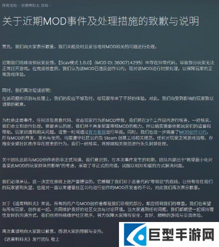近期我们陆续收到玩家反馈,【Scav模式 1.8.0】(MOD ID: 3600714295)中存在异常代码,导致部分玩家无法正常打开游戏。在完成核查后,我们认为该MOD已违反创作公约,现对该MOD进行封禁处理,以保障玩家的正常游戏体验。