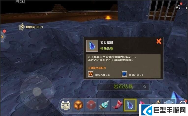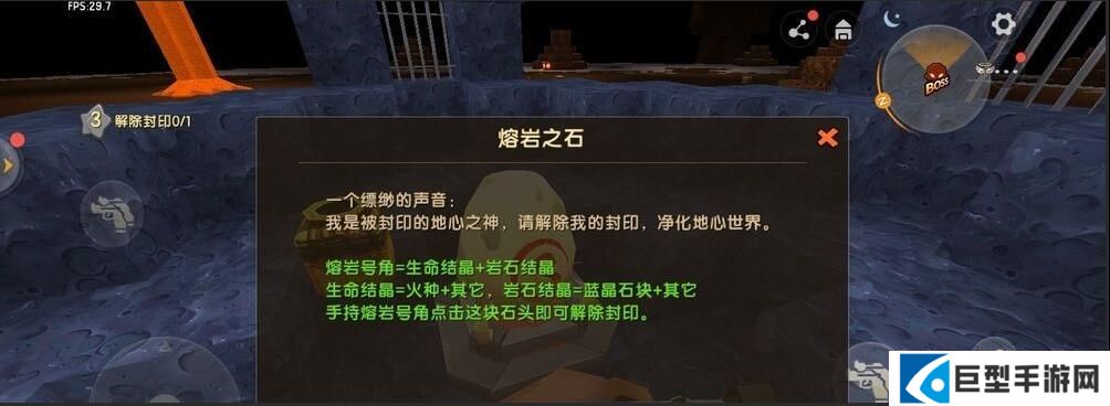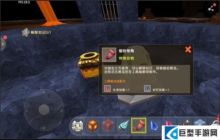 迷你世界熔岩之石检查的方法是:解除封印需要用到熔岩号角,这样即可检查完成,熔岩号角只能对熔岩之石使用,通过生命结晶和岩石结晶合成。