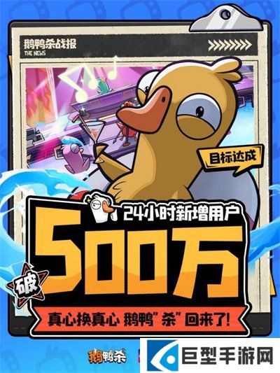 《鹅鸭杀》手游公测24小时新增用户破500万,金山携手虎牙打造年轻社交新平台