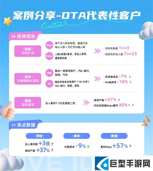 某OTA行业客户借助「星广联投」,实现了分端精细化投放,转化成本更低的同时实现了量效双赢。在投前阶段,品牌依据达人粉丝标签精准扩充供给,合作的机构数量与优质达人数显著增加;投中则分端精细化运营,安卓与iOS成本双降;投后通过混剪复用进一步提升素材效率。最终达人素材数增加3倍,素材ARPU提升57%,成功打造了可复制的投放模型。