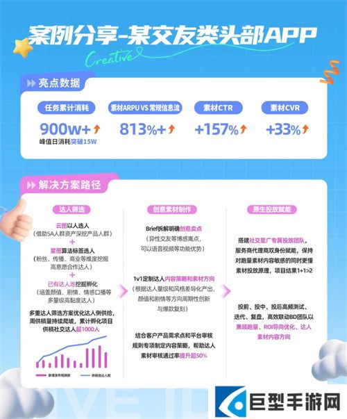该交友类头部品牌为应对素材同质化与宣传内容吸引力不足的增长挑战,迅速接入「星广联投」,以达人素材为核心提升投放质量与效能。通过云图精准筛选达人,并借助星图标签体系培育多垂类创作者,快速实现了高质量创意内容的稳定输出。项目周期内,星广素材ARPU显著提升398%,同时品牌素材与非品牌素材的曝光重合度仅为10%。「星广联投」助力品牌高效触达大量新用户,实现了规模化的破圈增长。