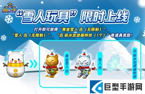 《跑跑卡丁车》“雪人玩具”现已登场!打开 “雪人玩具”即有机会获得“黄金雪人 迅(无限制)”、“雪人 迅(无限制)”、“迅 极冰加速器特效(1个)”等道具,切勿错过!