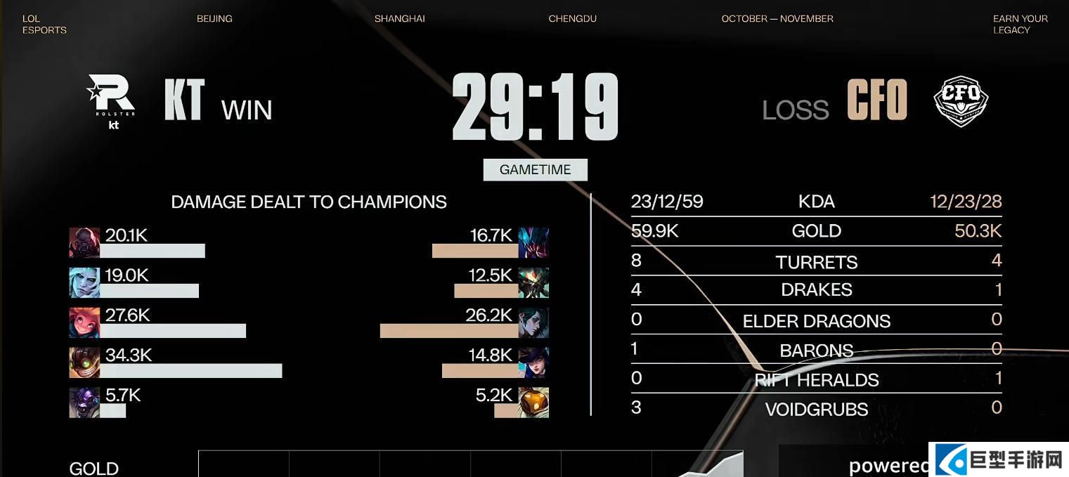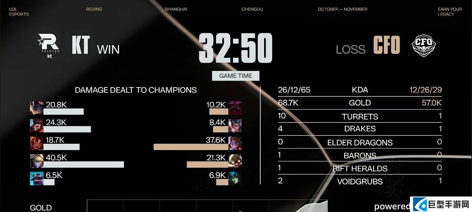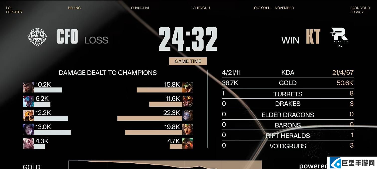 结果第三局比赛,又是被KT打成了的速胜局。比赛第8分钟 左右,中路爆发团战,KT打出1换3;比赛第12分钟左右,野区爆发团战,CFO抓住机会打出0换2;比赛第17分钟左右,爆发小龙团,CFO趁势追击打出0换2;比赛第20分钟左右,Bdd佐伊完美开团,KT打出3换5;最终比赛第28分钟,爆发龙魂团,KT打出1换4;最终29分19秒,KT零封CFO,首次挺进四强。
