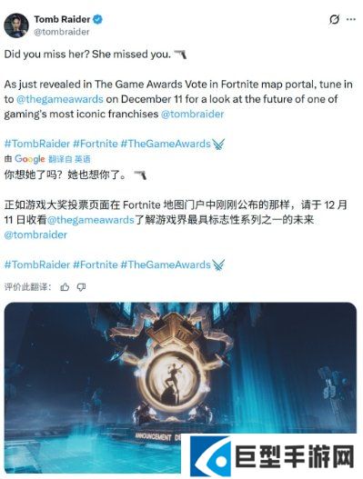 “你想她了吗?她也想你了。正如游戏大奖投票页面在《堡垒之夜》地图门户中刚刚公布的那样,请于12月11日收看@thegameawards,了解游戏界最具标志性系列之一的未来。”