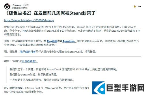 游戏发行方Neowiz已就此发表官方说明,确认Steam对游戏页面及社区功能进行了限制:“我们发现了一个问题,导致目前《棕色尘埃2》的 Steam 商店页面及社区功能受到限制。我们已与 Steam 保持沟通,并正努力尽快解决问题。一旦有最新进展,我们将及时告知。感谢大家的理解。”