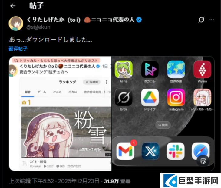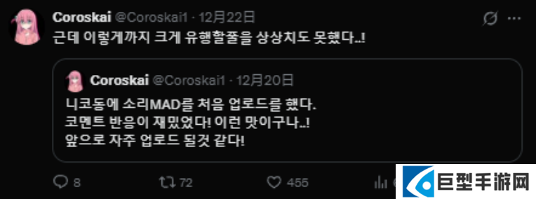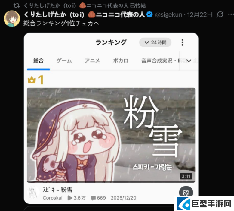 事情的高潮出现在12月21日,一位韩国UP主在niconico和YouTube更新了《スピキ - 粉雪》。这条神作瞬间成为N站镇站之宝,很快冲上全站综合第一。作者在推特称自己只是新人UP主,这是她的第一条斯皮奇meme视频,自己也没想到会如此受欢迎。果然新人都是怪物的定律不仅在B站鬼畜区,放到N站同样适用。12月22日斯皮奇登上YouTube热推榜首,同期又占领日本二次元精神故乡niconico全站综合第一,在YouTube和N站总会看到有人在评论区问【jo哇哟是什么意思】。