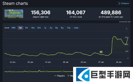 作为《泰拉瑞亚》近几年规模最大的更新之一,吸引了众多老玩家宠溺回坑,Steam同时在线玩家峰值骤升超17万,虽然距离历史上最高峰值的2020年5月48.9万人尚有距离,不过已经相当的火热了。