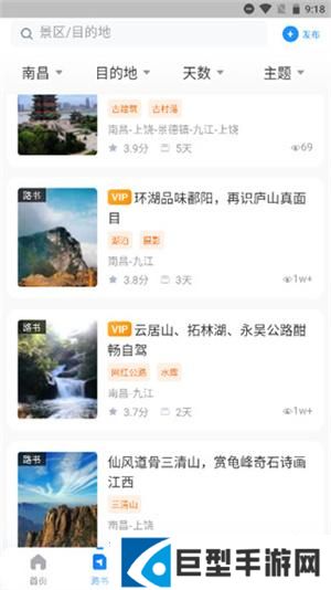 3、点击进入路书导航,你可以筛选出发地、目的地和行程天数,查看推荐的路书;