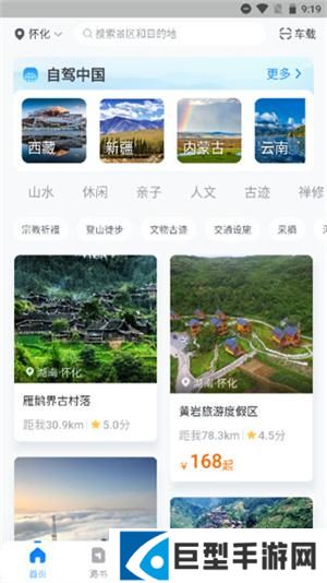 2、点击进入首页,你可以自行选择山水、人文、古村落、亲子游等,查看推荐去的地方;
