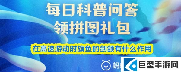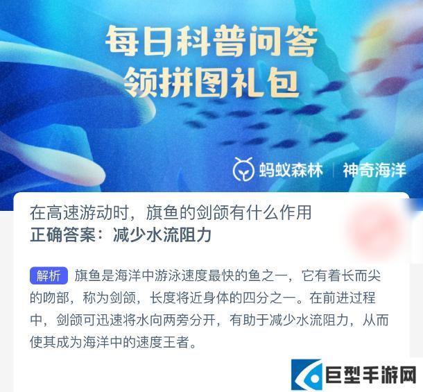 在高速游动时,旗鱼的剑颌有什么作用?【神奇海洋】10月31日新题目已开答!正确答案现已公布,点击领取拼图,一起为修复海洋生态贡献力量!今日正确答案是:【减少水流阻力】。旗鱼在前进过程中,剑颌可迅速将水向两旁分开,有助于减少水流阻力,从而使其成为海洋中的速度王者。