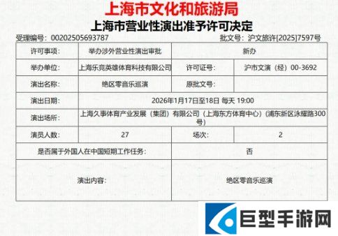 根据上海市文化和旅游局审批公告显示,《绝区零》音乐巡演已获得上海市营业性演出准予许可,演出时间为2026年1月17日至18日,演出地点为上海东方体育中心,承办方为英雄体育。